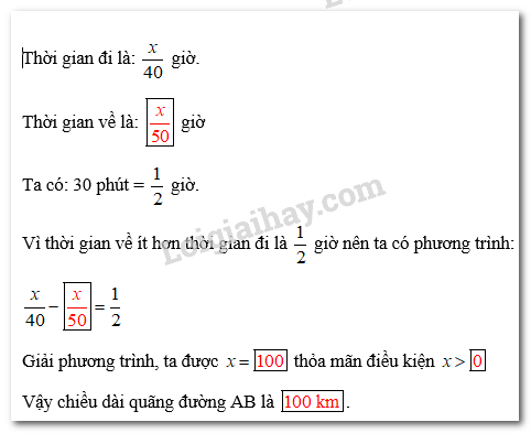 Thay dấu bằng các dữ liệu thích hợp để hoàn thành lời giải bài toán. Một người đi xe gắn máy từ A đến B với tốc độ (40km/h). Lúc về người đó đi với tốc độ (50km/h) nên thời gian về ít hơn thời gian đi là (30) phút. Tìm chiều dài quãng đường AB.