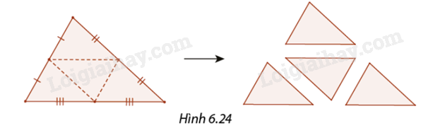 Giải thích vì sao khi cắt ba mảnh bìa hình tam giác theo ba đường trung bình của nó (Hình 6.24) thì ta được bốn tam giác bằng nhau.