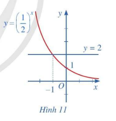 Quan sát Hình 11 và nêu nhận xét về tính đồng biến, nghịch biến của hàm số mũ \(y = {\left( {\frac{1}{2}} \right)^x}\). Từ đó, hãy tìm x sao cho \({\left( {\frac{1}{2}} \right)^x} > 2\)