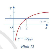 Quan sát Hình 12 và nêu nhận xét về tính đồng biến, nghịch biến của hàm số lôgarit \(y = {\log _2}x\). Từ đó, hãy tìm x sao cho \({\log _2}x > 1\)