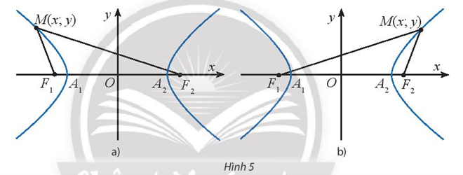 b) Giả sử điểm \(M(x;y)\) thuộc nhánh đi qua \({A_2}(a;0)\) (Hình 5b). Sử dụng kết quả đã chứng minh được ở câu a) kết hợp với tính chất \(M{F_1} – M{F_2} = 2a\) đã biết để chứng minh \(M{F_2} + M{F_1} = 2\frac{{cx}}{a}\). Từ đó, chứng minh các công thức: \(M{F_1} = a + \frac{c}{a}{x_0};M{F_2} =  – a + \frac{c}{a}{x_0}\)
