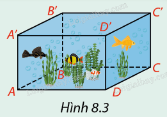 Ta biết hình hộp chữ nhật có 6 mặt là các hình chữ nhật. Quan sát một bể nuôi cá cảnh hình hộp chữ nhật (Hình 8.3). Xem mỗi cạnh của bể nuôi cá là hình ảnh thể hiện một đường thẳng. Hãy chỉ ra những đường thẳng tạo với \(AA’\) một góc \({90^o}\). Trong mỗi trường hợp, hãy cho biết vị trí tương đối của \(AA’\) và đường thẳng đã chỉ ra.