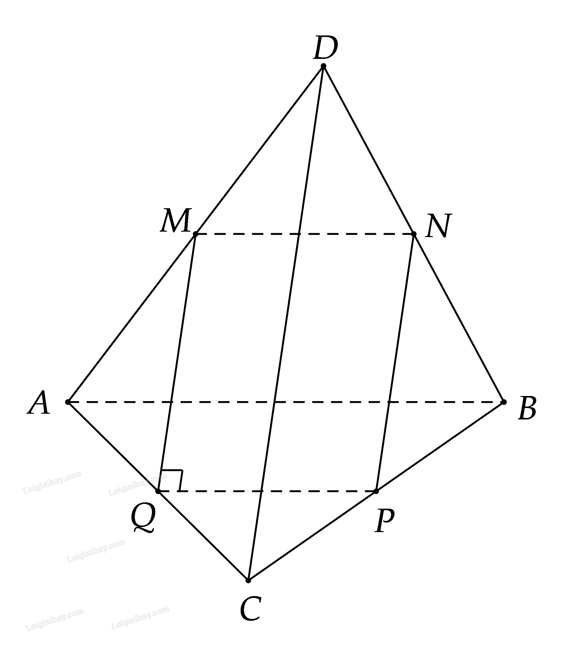 Suy ra \(\left( {AB,CD} \right) = \left( {PQ,MQ} \right)\). Mà \(MNPQ\) là một hình chữ nhật nên \(\widehat {MQP} = {90^o}\)