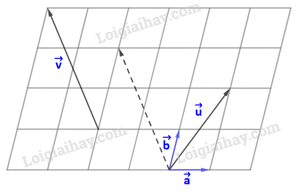 Trong hình 4.27, hãy biểu thị mỗi vecto \(\overrightarrow u ,\;\overrightarrow v \) theo hai vecto \(\overrightarrow a ,\;\overrightarrow b \), tức là tìm các số \(x,y,z,t\) để \(\overrightarrow u  = x\overrightarrow a  + y\overrightarrow b ,\;\overrightarrow v  = t\overrightarrow a  + z\overrightarrow b .\).