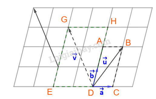 Ta dựng được hình hình hành ABCD và DEGH. Trong đó:  DC và DE nằm trên giá của vecto \(\overrightarrow a \), DA và DH nằm trên giá của vecto \(\overrightarrow b \), còn vecto \(\overrightarrow u ,\;\overrightarrow v \) lần lượt là hai dường chéo.