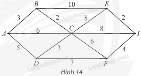 Tìm đường đi ngắn nhất từ đỉnh A đến đỉnh I trong đồ thị có trọng số ở Hình 14.