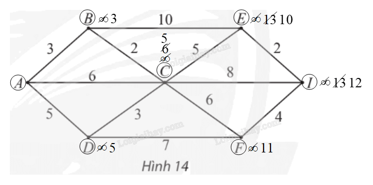 ⦁ \({n_I}\; = {\rm{ }}{n_C}\; + {\rm{ }}{w_{CI}}\; = {\rm{ }}5{\rm{ }} + {\rm{ }}8{\rm{ }} = {\rm{ }}13\).Vì \(13{\rm{ }} < {\rm{ }}\infty \) nên ta đổi nhãn của I thành 13.