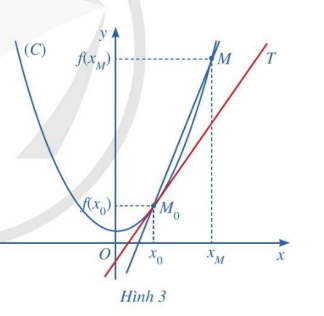 Cho hàm số y = f(x) có đồ thị (C), một điểm \({M_0}\) cố định thuộc (C) có hoành độ \({x_0}\). Với mỗi điểm M thuộc (C) khác \({M_0}\), kí hiệu \({x_M}\) là hoành độ của điểm M và \({k_M}\) là hệ số góc của cát tuyến \({M_0}M\). Giả sử tồn tại giới hạn hữu hạn \({k_0} = \mathop {\lim }\limits_{{x_M} \to {x_0}} {k_M}\). Khi đó, ta coi đường thẳng \({M_0}T\) đi qua \({M_0}\) và có hệ số góc là \({k_0}\) là ví trị giới hạn của cát tuyến \({M_0}M\) khi điểm M di chuyển dọc theo (C) dần tới \({M_0}\) . Đường thẳng \({M_0}T\)được gọi là tiếp tuyến của (C) tại điểm \({M_0}\), còn \({M_0}\) được gọi là tiếp điểm (Hình 3).