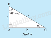 a) Tính các tỉ số lượng giác của góc \(\alpha \) và của góc 90o -\(\alpha \) trong Hình 8 theo a, b, c.