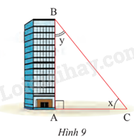 Tia nắng chiếu qua điểm B của nóc tòa nhà tạo với mặt đất một góc x và tạo với cạnh AB của tòa nhà một góc y (Hình 9). Cho biết cos x \( \approx 0,78\) và cot x \( \approx 1,25\). Tính sin y và tan y (kết quả làm tròn đến hàng phần trăm).
