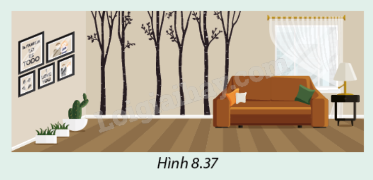 Trong phòng khách của một căn nhà, bức tường và nền nhà vuông góc nhau. Họa sĩ về một hàng cây trên bức tường với thân cây vuông góc với gờ của mảng gỗ ép sát bức tường (Hình 8.37). Các cây này có vuông góc với nền nhà không? Vì sao?