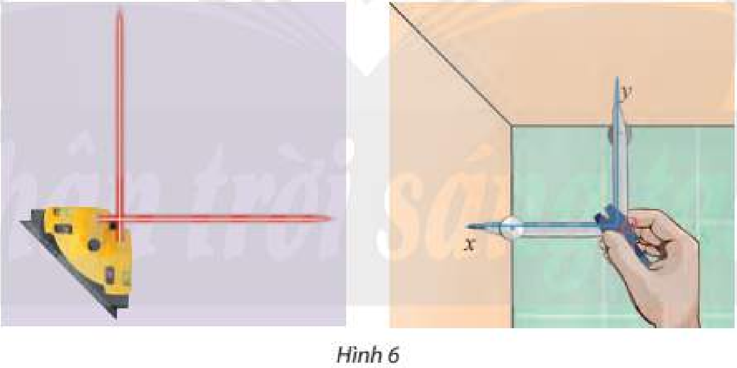 Đặt êke sao cho hai cạnh góc vuông của hai êke chạm nhau tạo thành một đường thẳng, hai cạnh còn lại của hai êke sát với mặt sàn.