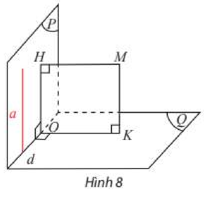 Cho hai mặt phẳng \(\left( P \right)\) và \(\left( Q \right)\) cắt nhau theo giao tuyến \(d\) điểm \(M\) không thuộc \(\left( P \right)\) và \(\left( Q \right)\). Gọi \(H\) và \(K\) lần lượt là hình chiếu vuông góc của \(M\) lên \(\left( P \right)\) và \(\left( Q \right)\). Gọi \(O\) là giao điểm của \(d\) và \(\left( {MHK} \right)\) (Hình 8).