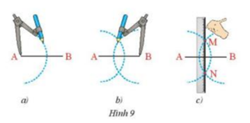 – Hai cung tròn này cắt nhau tại M và N (Hình 9c). Dùng thước vẽ đường thẳng MN. Hãy chứng minh đường thẳng MN chính là đường trung trực của đoạn thẳng AB.