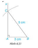 Vẽ tam giác vuông ABC có A = 90°, AB = 3 cm, BC = 5 cm theo các bước sau: • Dùng thước thẳng có vạch chia vẽ đoạn thẳng AB = 3 cm. • Vẽ tia Ax vuông góc với AB và cung tròn tâm B bán kính 5 cm như Hình 4.51. Cung tròn cắt tia Ax tại điểm C. •Vẽ đoạn thẳng BC ta được tam giác ABC.