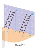 Có hai chiếc thang dài như nhau được dựa vào một bức tường với cùng độ cao BH = B’H’ như Hình 4.55. Các góc BAH và B’A’H có bằng nhau không? Vì sao?