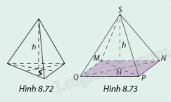 Viết công thức tính thể tích khối chóp tam giác đều (Hình 8.72) và khối chóp tứ giác đều (Hình 8.73) theo diện tích đáy S và chiều cao h của chúng.