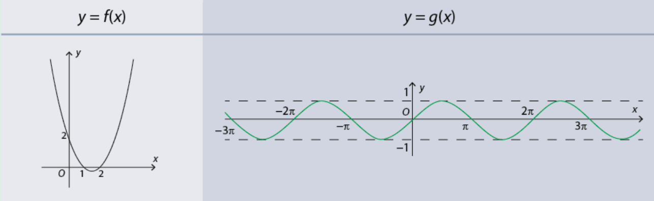 Các hàm số \(f\left( x \right) = {x^3} – 3x + 2\) và \(g\left( x \right) = \sin x\) xác định trên \(\left( { – \infty ; + \infty } \right)\) có đồ thị như sau: