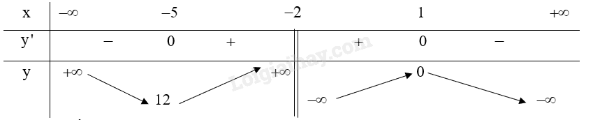 Hàm số đạt cực tiểu tại \(x =  – 5\) và \({y_{CT}} = 12\).