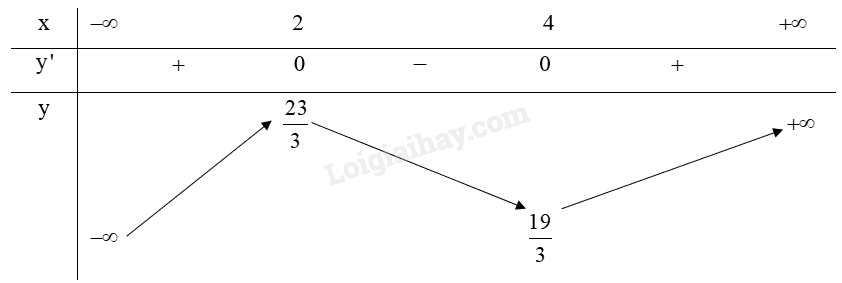 \(y’ = {x^2} – 6x + 8\), \(y’ = 0 \Leftrightarrow {x^2} – 6x + 8 = 0 \Leftrightarrow \left[ \begin{array}{l}x = 4\\x = 2\end{array} \right.\)