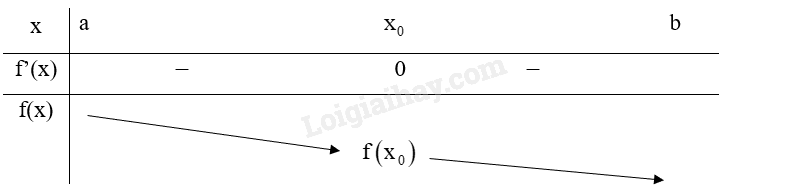 TH1: \(f’\left( x \right) < 0\) với mọi \(x \in \left( {a;{x_0}} \right)\) và \(f’\left( x \right) < 0\) với mọi \(x \in \left( {{x_0};b} \right)\), ta có bảng biến thiên: