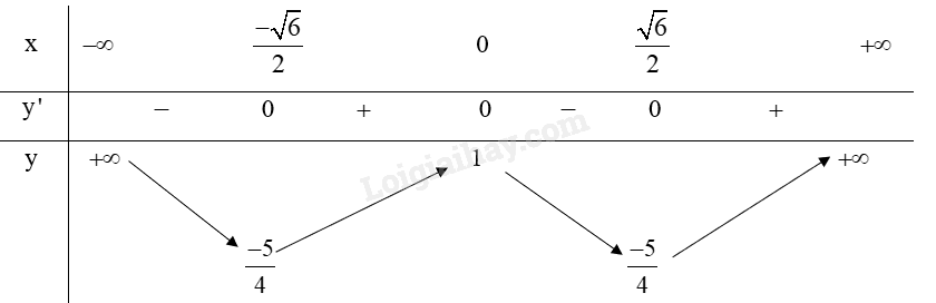 Hàm số đạt cực tiểu tại \(x =  \pm \frac{{\sqrt 6 }}{2}\) và \({y_{CT}} = \frac{{ – 5}}{4}\).