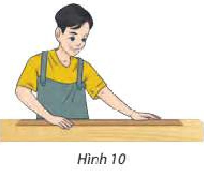 Quan sát Hình 10 và cho biết người thợ mộc kiểm tra mặt bàn có phẳng hay không bằng một cây thước thẳng như thế nào.