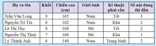 Thông tin về 5 bạn học sinh trong câu lạc bộ cầu lông của trường Trung học cơ sở Quang Trung tham gia giải đấu của tỉnh được cho bởi bảng1 thống kê sau: