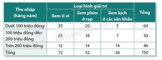 Bảng bên dưới cho kết quả khảo sát một nhóm gồm 150 người liên quan đến mức thu nhập (hàng năm) và loại hình giải trí mà họ yêu thích.