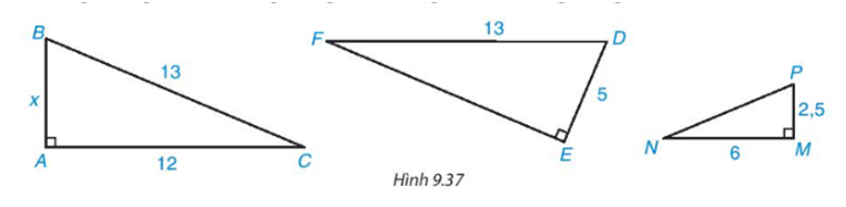 Cho tam giác vuông với kích thước như Hình 9.37. Hãy tính độ dài x và cho biết những tam giác nào đồng dạng, viết đúng kí hiệu đồng dạng