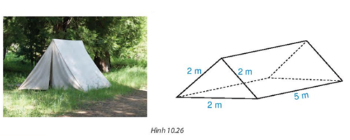Một lều chữ A dạng hình lăng trụ đứng có kích thước như hình 10.26. Tính diện tích vải để làm hai mái và trải đáy của lều.