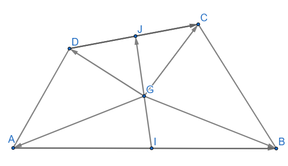 \( \Leftrightarrow 2\overrightarrow {GI}  + \left( {\overrightarrow {IA}  + \overrightarrow {IB} } \right) + 2\overrightarrow {GJ}  + \left( {\overrightarrow {JC}  + \overrightarrow {JD} } \right) = \overrightarrow 0 \)