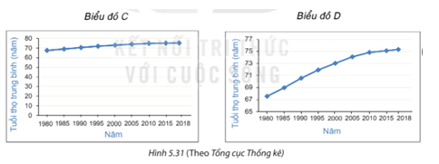 Cho hai biểu đồ biểu diễn tuổi thọ trung bình của người Việt Nam qua các năm (H.5.31).
