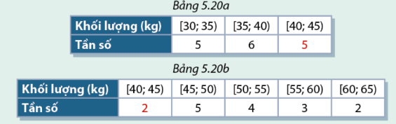 c, Hãy giải thích vì sao Bảng 5.20 aBảng 5.20 b tương ứng là bảng phân bố tần số của nhóm dưới và bảng phân bố tần số của nhóm trên.