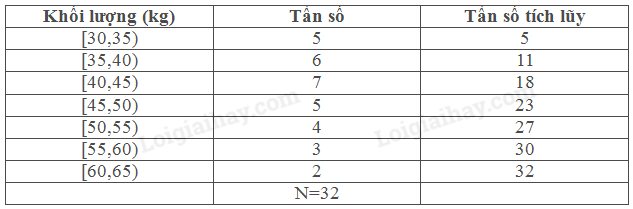 Ta có: \(\frac{N}{2} = \frac{{32}}{2} = 16\). Nhóm trung vị là [40,45).