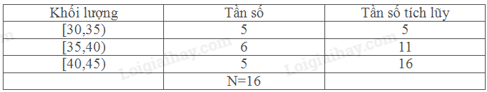 Ta có:\(\frac{N}{2} = \frac{{16}}{2} = 8\). Nhóm trung vị là [35,40).