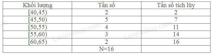 Ta có:\(\frac{N}{2} = \frac{{16}}{2} = 8\). Nhóm trung vị là [50,55).