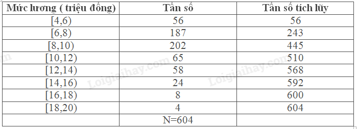 Ta có: \({L_1} = 6,{n_1} = 187,{T_1} = 56\)\( \Rightarrow {Q_1} = {L_1} + \frac{{\frac{N}{4} – {T_1}}}{{{n_1}}}.h = 6 + \frac{{151 – 56}}{{187}}.2 \approx 7,02\)( triệu đồng)