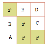 \(\begin{array}{l}A = {2^{12}}:{2^6}:{2^5} = {2^{12 – 6 – 5}} = {2^1} = 2;\\B = {2^{12}}:{2^1}:{2^3} = {2^{12 – 1 – 3}} = {2^8};\\C = {2^{12}}:{2^8}:{2^4} = {2^{12 – 8 – 4}} = {2^0} = 1;\\D = {2^{12}}:{2^0}:{2^5} = {2^{12 – 0 – 5}} = {2^7};\\E = {2^{12}}:{2^7}:{2^3} = {2^{12 – 7 – 3}} = {2^2}\end{array}\)