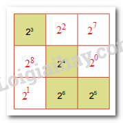 Tích của mỗi hàng, cột, đường chéo bằng: \({2^3}{.2^4}{.2^5} = {2^{3 + 4 + 5}} = {2^{12}}\)