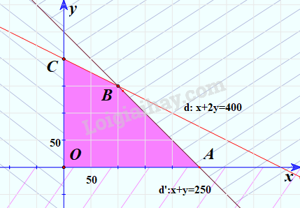 Vậy ta có hệ bất phương trình \(\left\{ \begin{array}{l}x \ge 0\\y \ge 0\\x + 2y \le 400\\x + y \le 250\end{array} \right.\)