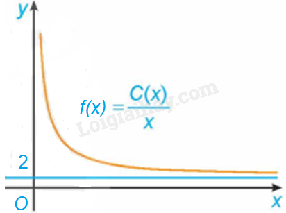 Điều này được thể hiện trong Hình 1.27 là đồ thị hàm số \(f\left( x \right) = \frac{{C\left( x \right)}}{x}\) có tiệm cận ngang là đường thẳng \(y = 2\) và đi xuống trong khoảng \(\left( {0; + \infty } \right)\).