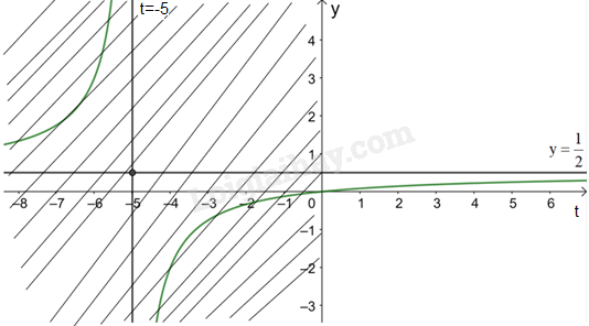 Đồ thị hàm số \(f\left( t \right) = \frac{{20t}}{{40t + 200}},t \ge 0\) là phần màu xanh không bị gạch chéo.