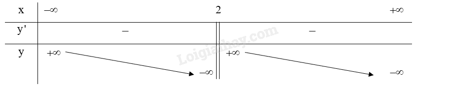 Hàm số nghịch biến trên khoảng \(\left( { – \infty ;2} \right)\) và \(\left( {2; + \infty } \right)\).