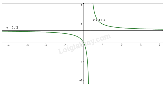 \(\mathop {\lim }\limits_{x \to {{\frac{1}{3}}^ + }} y = \mathop {\lim }\limits_{x \to {{\frac{1}{3}}^ + }} \frac{{2x}}{{3x – 1}} =  + \infty ;\mathop {\lim }\limits_{x \to {{\frac{1}{3}}^ – }} y = \mathop {\lim }\limits_{x \to {{\frac{1}{3}}^ – }} \frac{{2x}}{{3x – 1}} =  – \infty \) nên x = \(\frac{1}{3}\) là tiệm cận đứng của đồ thị hàm số