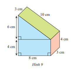 Bạn Nam đã làm một chiếc hộp hình lăng trụ đứng với kích thước như Hình 9. Bạn ấy định sơn các mặt của chiếc hộp, trừ mặt bên dưới. Tính diện tích cần sơn.