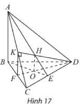 Tứ diện \(ABCD\) có \(AB \bot \left( {BCD} \right)\). Trong tam giác \(BCD\) vẽ đường cao \(BE\) và \(DF\) cắt nhau tại \(O\). Trong mặt phẳng \(\left( {ACD} \right)\) vẽ \({\rm{D}}K\) vuông góc với \(AC\) tại \(K\). Gọi \(H\) là trực tâm của tam giác \(ACD\). Chứng minh rằng: