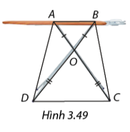 Để cầu là được thăng bằng khi là quần áo, người ta thiết kế hai chân \(AC,BD\) cắt nhau tại O sao cho \(OA = OB\) và \(OC = OD\) (Hình 3.49). Giải thích vì sao khi đó đường thẳng \(AB\) trên mặt cầu là song song với đường thẳng \(CD\) trên mặt đất. Tứ giác \(ABCD\) là hình gì?