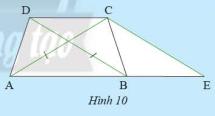 Cho hình thang \(ABCD\) có hai đáy là \(AB\), \(CD\) và có hai đường chéo bằng nhau (Hình 10). Vẽ đường thẳng đi qua \(C\), song song với \(BD\) và cắt \(AB\) tại \(E\).