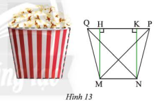 Mặt cắt của một li giấy đựng bỏng ngô có dạng hình thang cân \(MNPQ\) (Hình 13) với hai đáy \(MN = 6cm\), \(PQ = 10\)cm và độ dài hai đường chéo \(MN = NQ = 8\sqrt 2 \) cm. Tính độ dài đường chéo và cạnh bên của hình thang